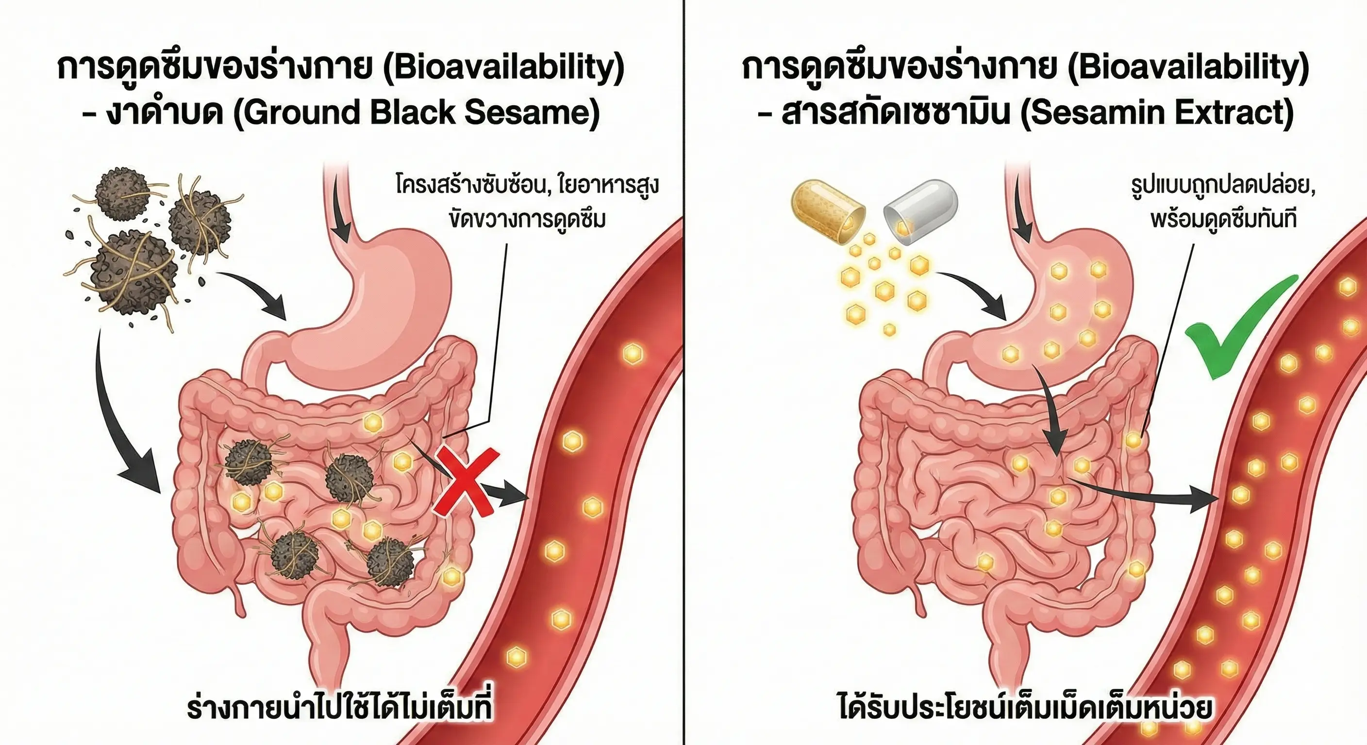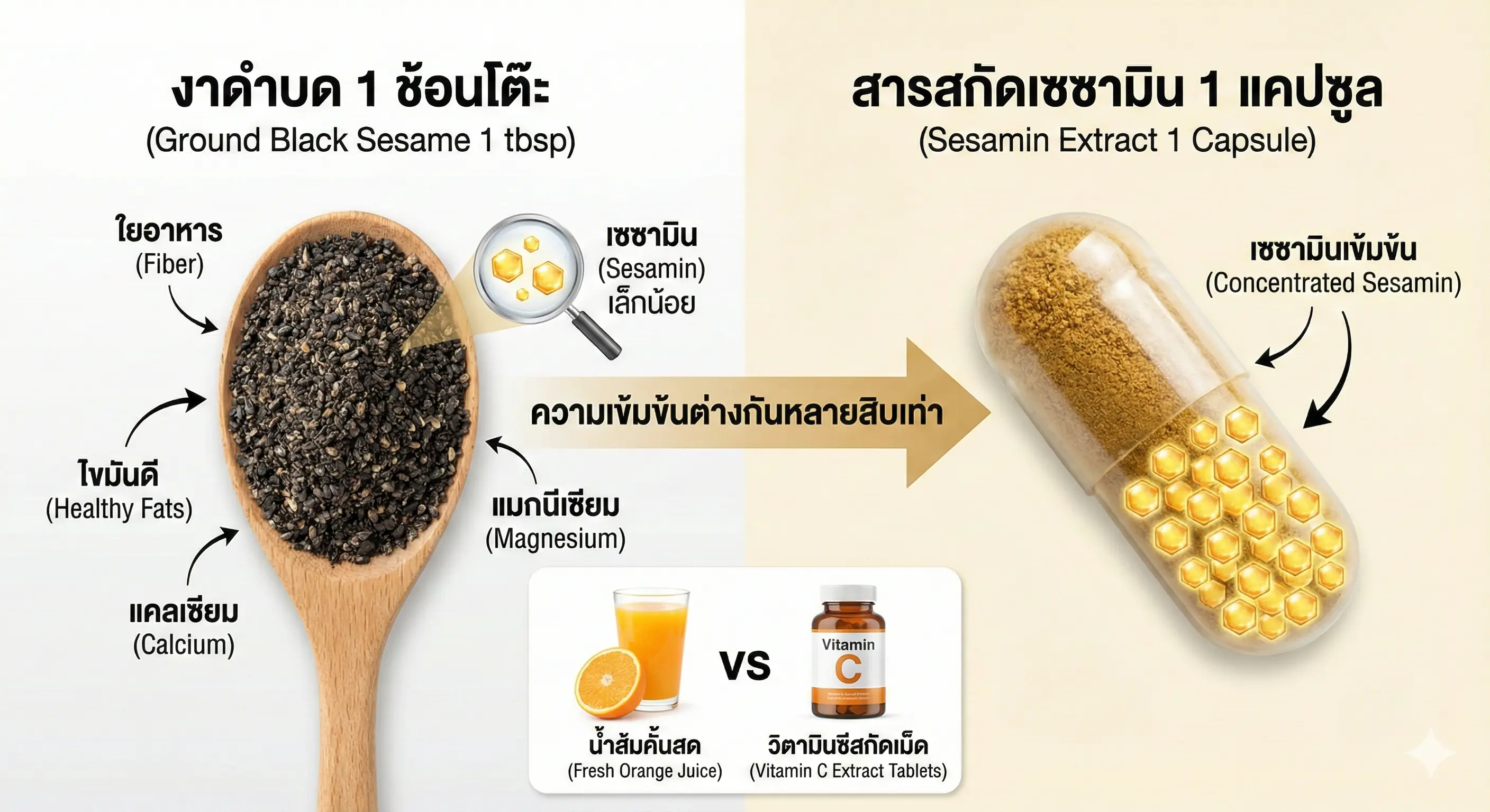 เปรียบเหมือน: การทานงาดำบดก็เหมือนการ "ดื่มน้ำส้มคั้นสด" ซึ่งได้ทั้งน้ำ วิตามิน และกากใย แต่การทานสารสกัดเซซามินก็เหมือนการทาน "วิตามินซีสกัดเม็ด" ที่คุณจะได้รับวิตามินซีในปริมาณที่เข้มข้นและแน่นอนกว่านั่นเอง