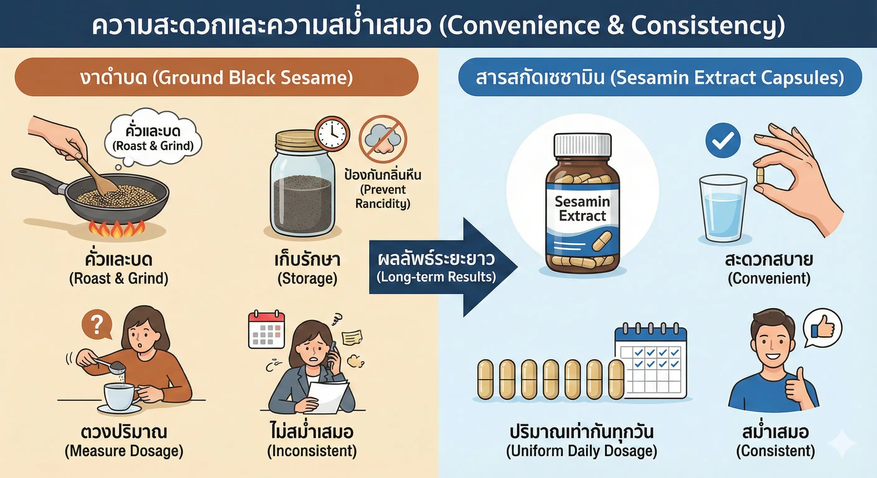 แต่หากเป้าหมายของคุณคือการได้รับคุณประโยชน์จาก "เซซามิน" โดยตรงและเต็มที่ เพื่อมุ่งหวังผลในด้านการต้านอนุมูลอิสระ, การลดการอักเสบ, หรือการดูแลสุขภาพเฉพาะทาง การเลือกทานในรูปแบบ "สารสกัดเซซามิน" คือคำตอบที่ตรงจุด, มีประสิทธิภาพ, และเห็นผลลัพธ์ที่ชัดเจนกว่า
