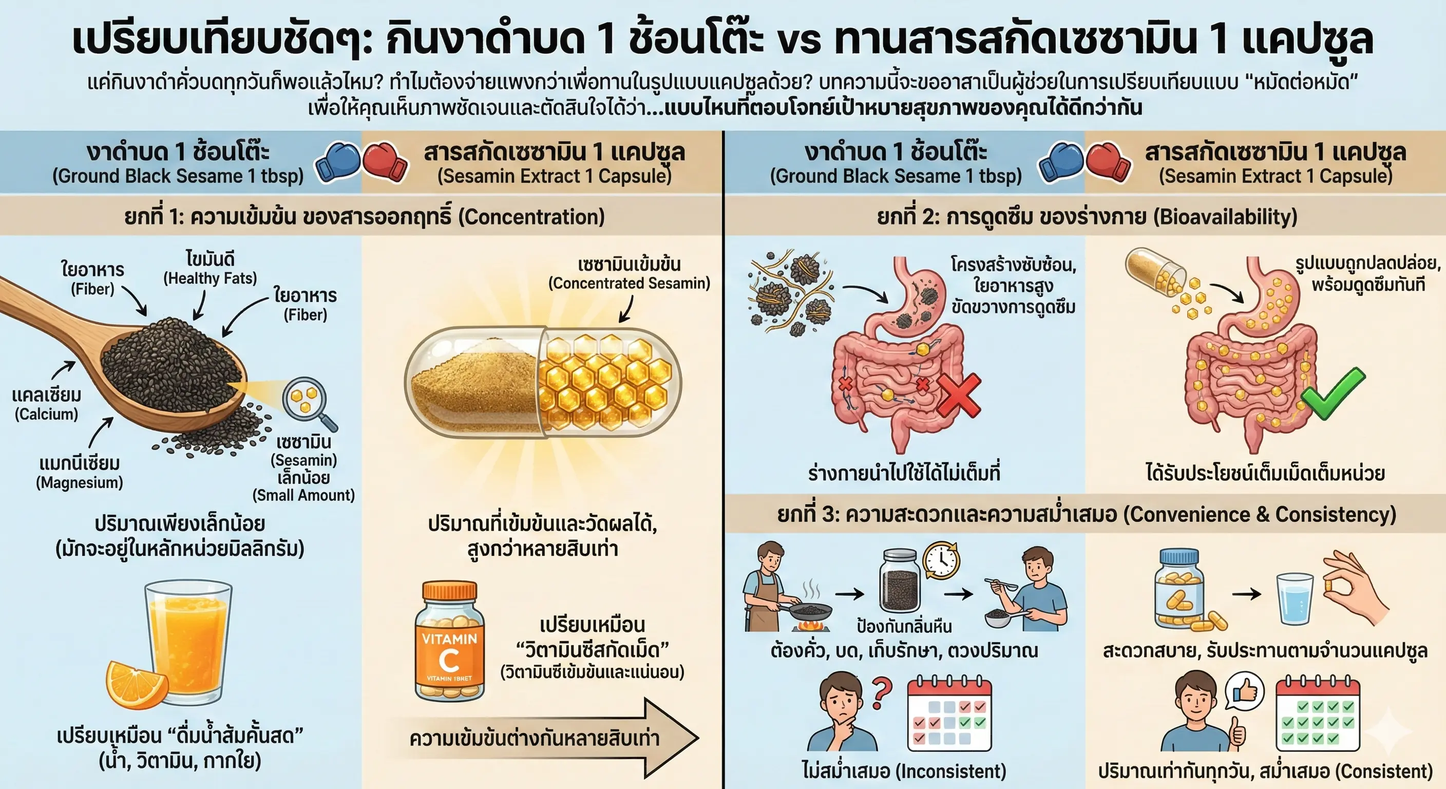 กินงาดำบด 1 ช้อนโต๊ะ vs ทานสารสกัดเซซามิน 1 แคปซูล