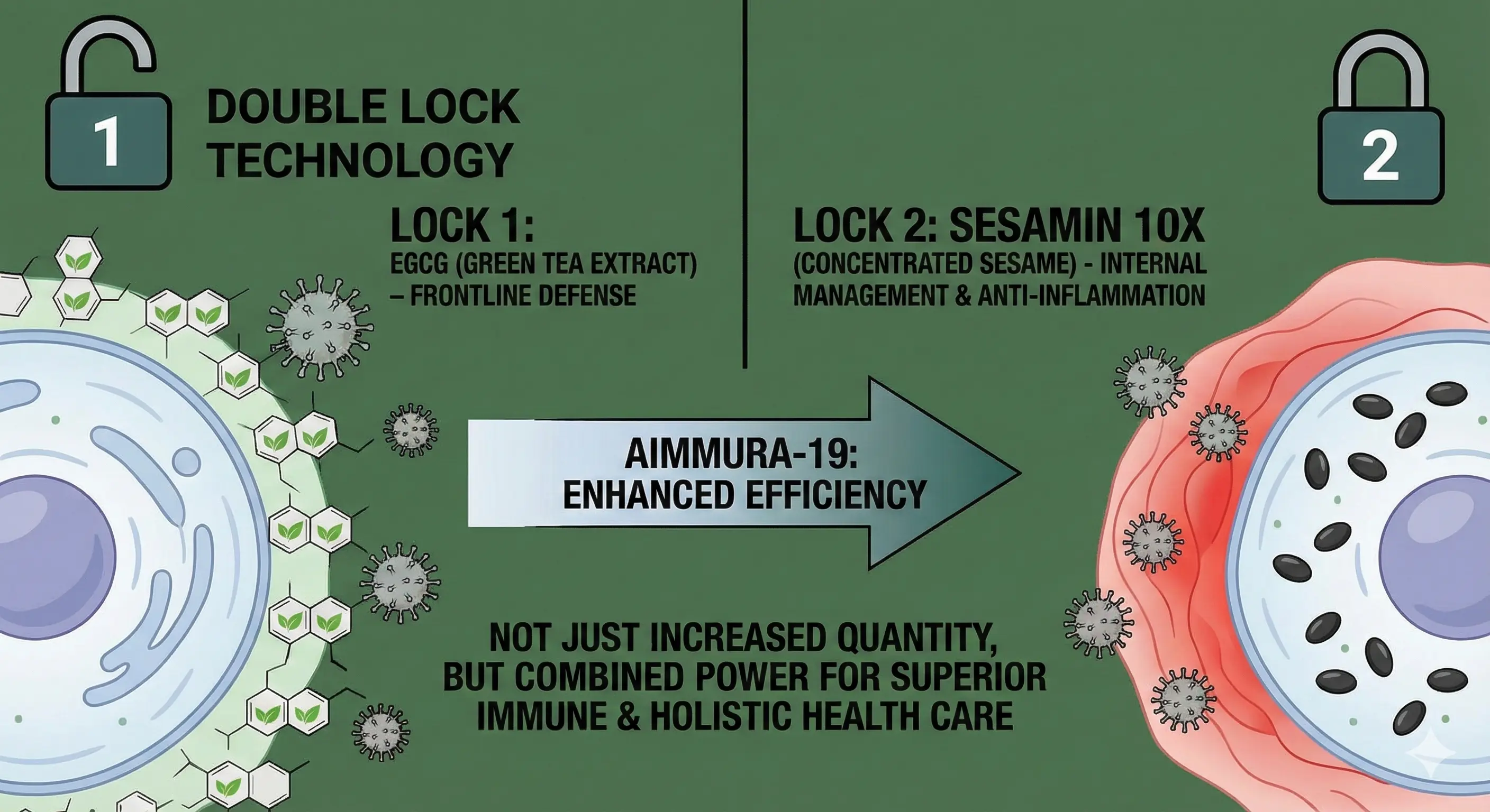 จากความสำเร็จของ Aimmura-O สู่การต่อยอดงานวิจัยเพื่อค้นหาสูตรที่ทรงประสิทธิภาพที่สุดในการรับมือกับความท้าทายทางสุขภาพยุคใหม่ เกิดเป็น AIMMURA-19 เอมมูร่า 19 ที่มาพร้อมกลไกการทำงานแบบ "Double Lock (ล็อก 2 ชั้น)":