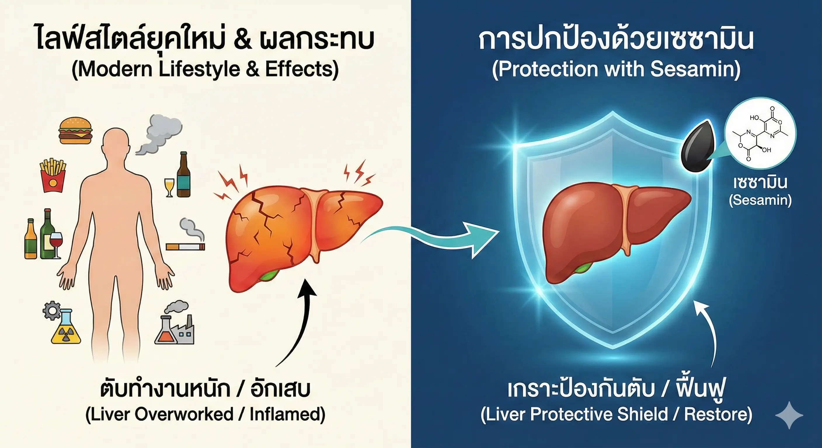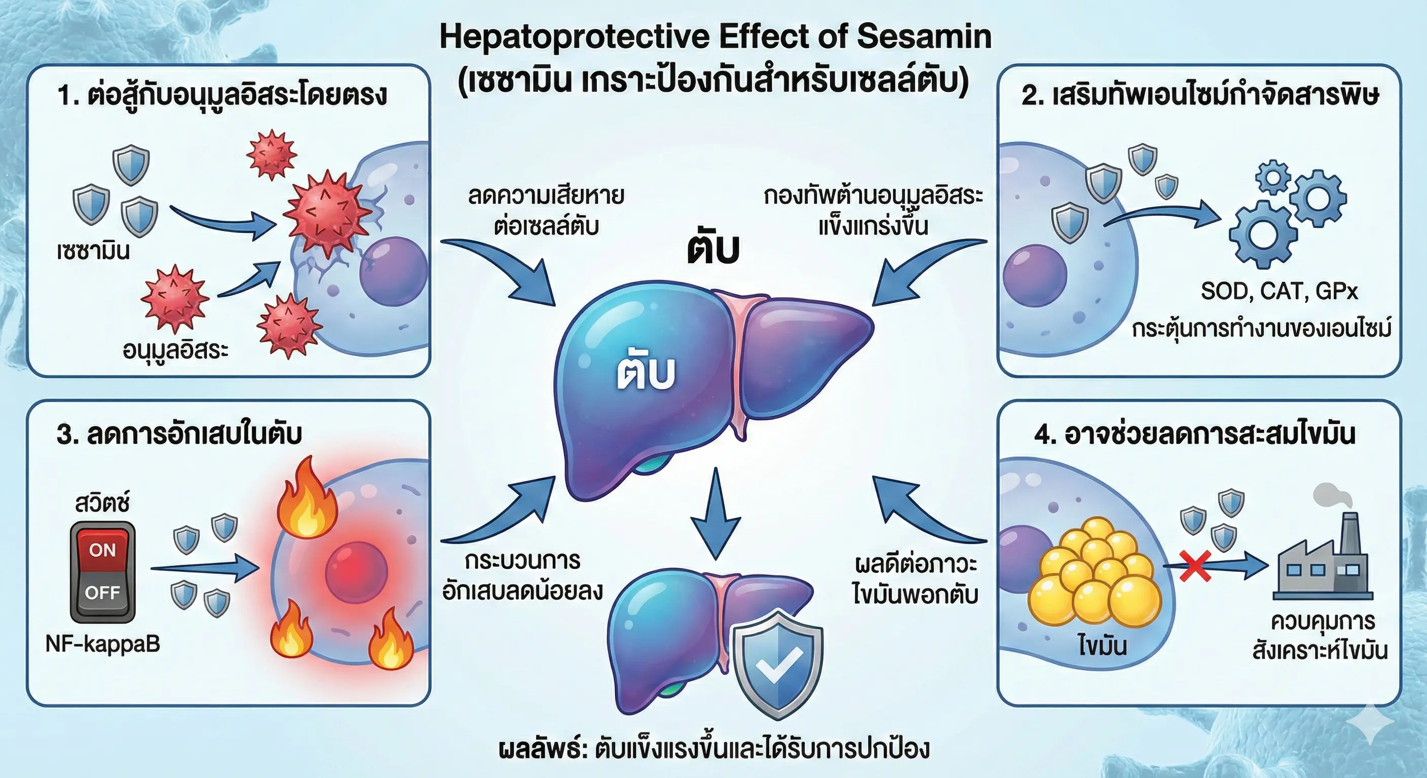ภาวะเครียดออกซิเดชัน (Oxidative Stress): นี่คือ "กลไกร่วม" ที่เกิดจากทุกปัจจัยข้างต้น คือการเกิดอนุมูลอิสระจำนวนมากเข้าไปโจมตีและทำลายเซลล์ตับโดยตรง"เซซามิน" เกราะป้องกันสำหรับเซลล์ตับ (Hepatoprotective Effect)