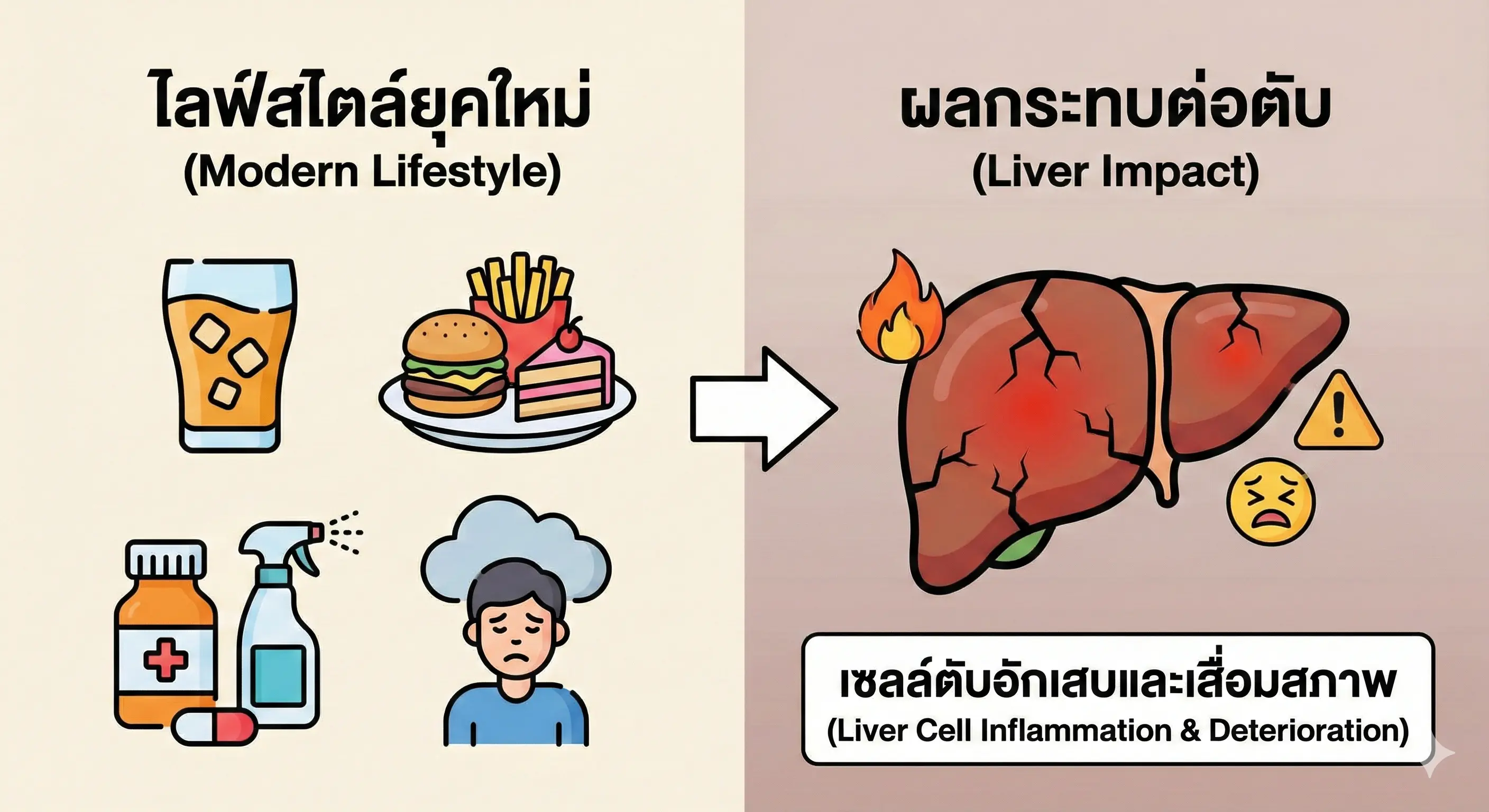 - ไขมันและน้ำตาลส่วนเกิน: เมื่อมีมากเกินไป ตับจะนำไปเก็บสะสมไว้ในเซลล์ของตัวเอง จนเกิดภาวะ "ไขมันพอกตับ" (Fatty Liver Disease) ซึ่งนำไปสู่การอักเสบและตับแข็งได้