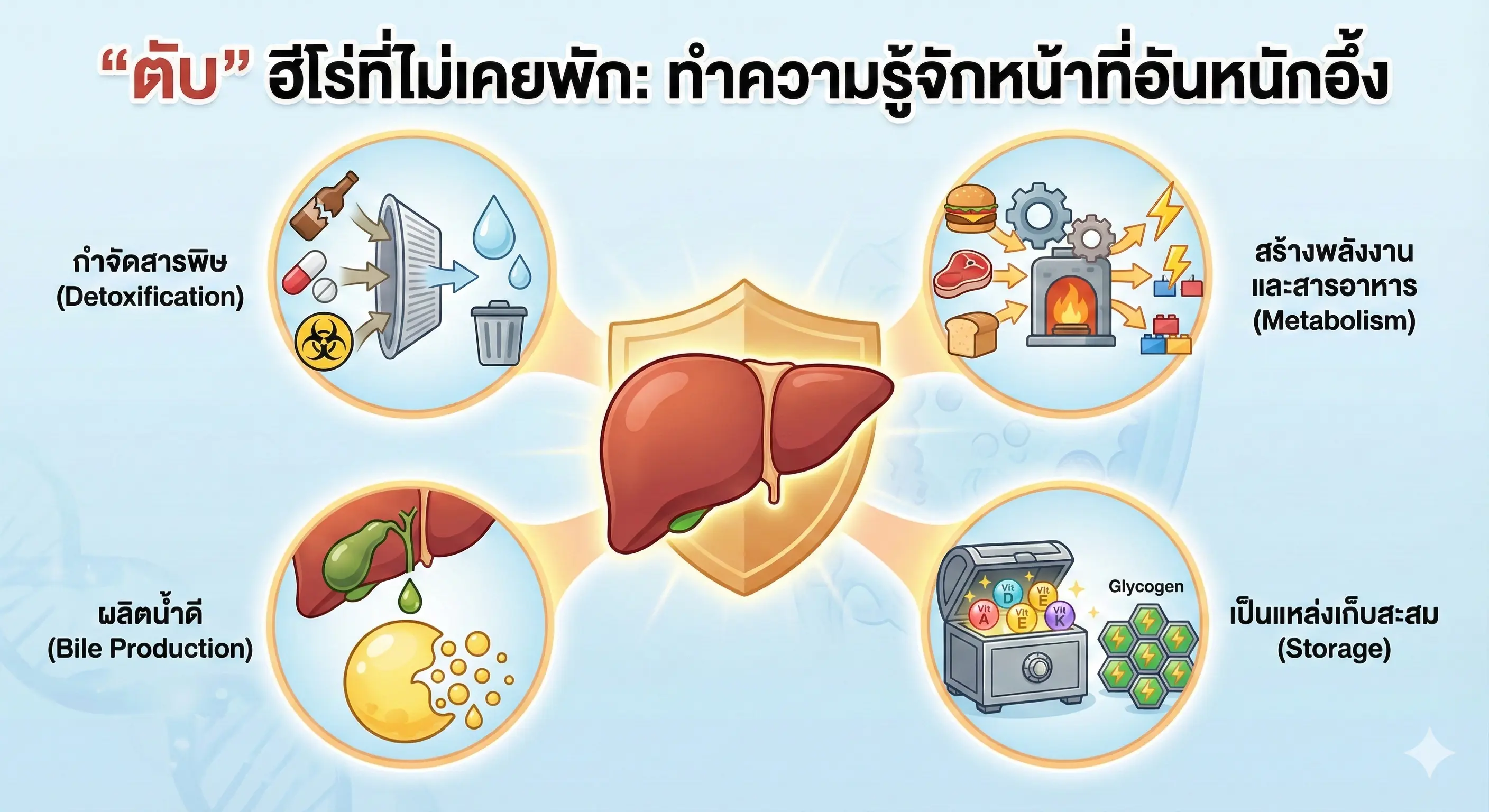 เป็นแหล่งเก็บสะสม (Storage): กักเก็บวิตามินที่ละลายในไขมัน (A, D, E, K) และพลังงานสำรองในรูปของไกลโคเจนภัยร้ายที่คอยทำลายตับในชีวิตประจำวัน