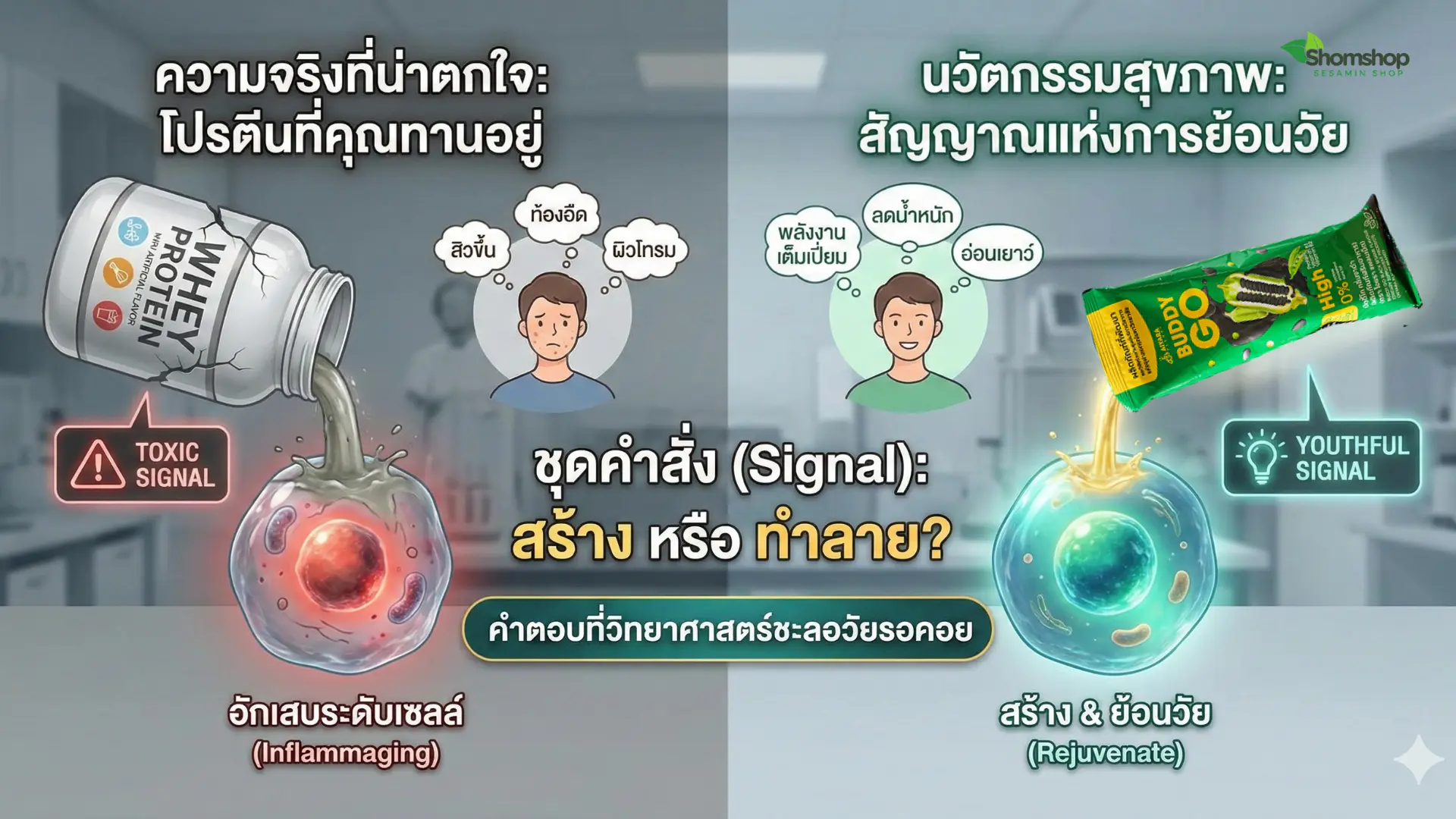 คุณเคยสงสัยไหมว่า... ทำไมหลายคนยิ่งดื่มเวย์โปรตีน ผิวกลับยิ่งดูโทรม สิวขึ้น หรือมีอาการท้องอืดเรื้อรัง? ในฐานะนักธุรกิจที่คลุกคลีอยู่กับนวัตกรรมสุขภาพ ผมพบว่า "โปรตีน" ไม่ได้มีค่าแค่ที่จำนวนกรัมข้างกล่อง แต่มันคือ "ชุดคำสั่ง (Signal)" ที่จะบอกให้ร่างกายของคุณ "สร้าง" หรือ "ทำลาย"