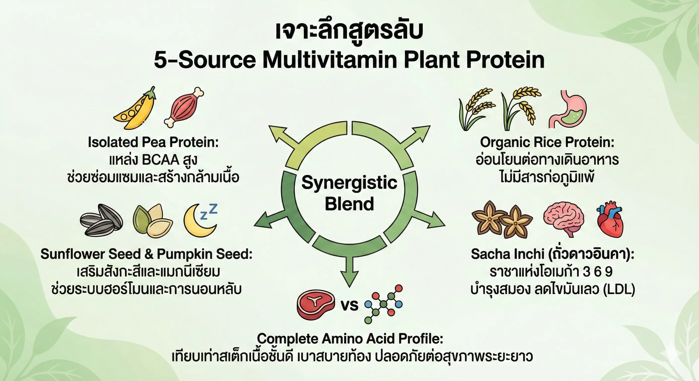 เราไม่ได้เลือกใช้เพียง "ถั่วเหลือง" เหมือนแบรนด์ทั่วไป แต่เราออกแบบ Synergistic Blend จากพืช 5 ชนิด เพื่อให้ได้โปรตีนที่สมบูรณ์แบบที่สุด: