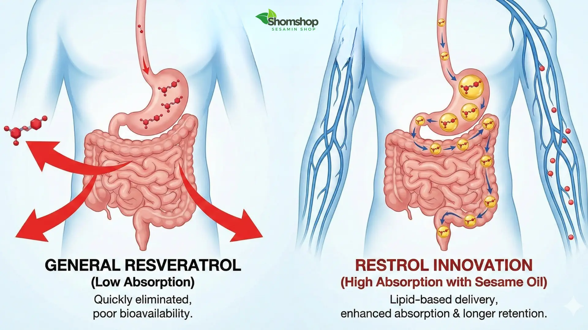 น้ำมันงาทำหน้าที่เป็นตัวนำพาสารอาหาร (Lipid-based delivery) ที่ช่วยให้เรสเวอราทรอลถูกดูดซึมเข้าสู่กระแสเลือดได้สูงกว่า และคงอยู่ในร่างกายได้นานกว่าสูตรปกติในท้องตลาด ทำให้ร่างกายได้รับคุณประโยชน์จากสารสกัดอย่างเต็มเม็ดเต็มหน่วย