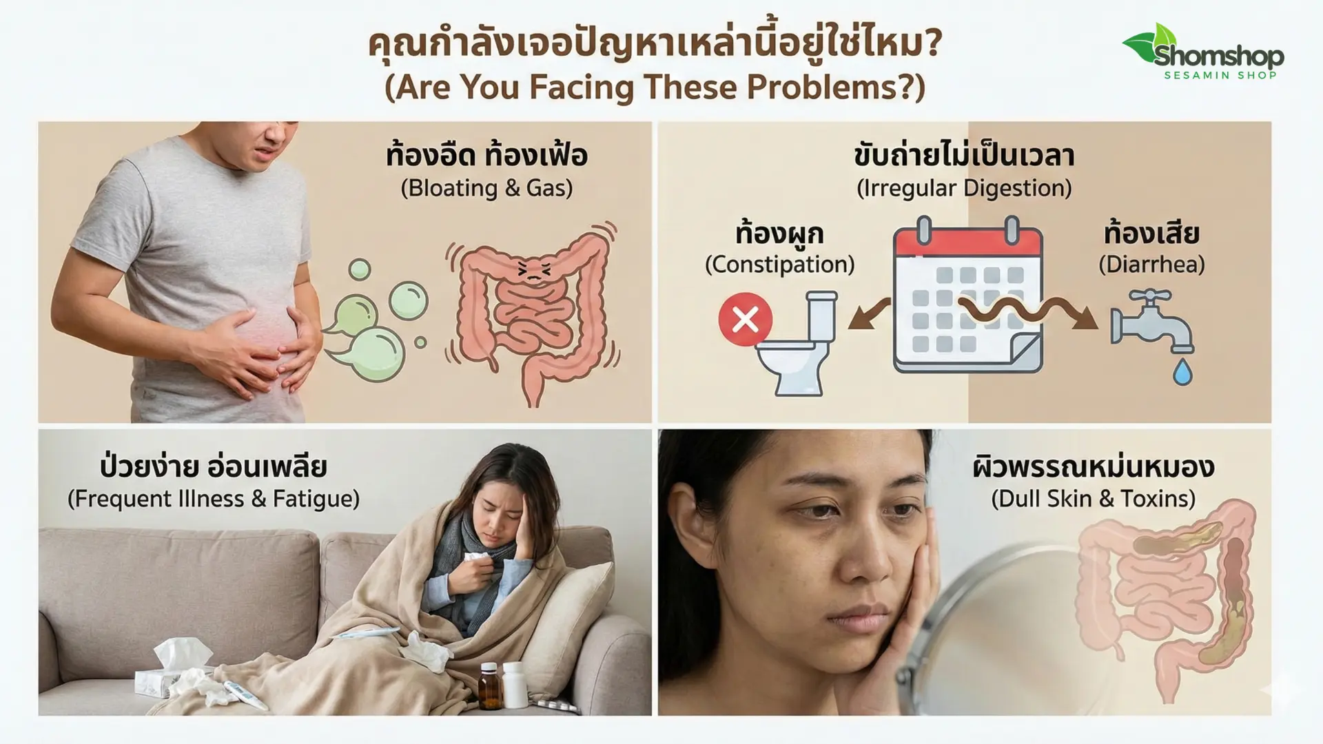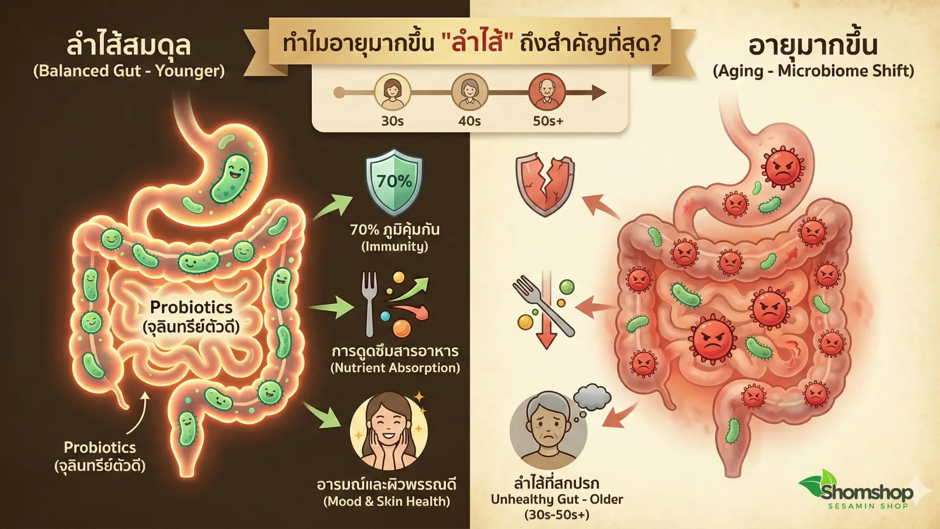เมื่อเราก้าวเข้าสู่เลข 3 เลข 4 หรือเลข 5 ระบบนิเวศในลำไส้ของเราจะเริ่มเปลี่ยนไป จุลินทรีย์ตัวดี (Probiotics) ลดน้อยลง ขณะที่จุลินทรีย์ตัวร้ายเพิ่มขึ้น ส่งผลกระทบต่อ:
