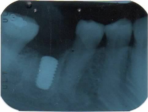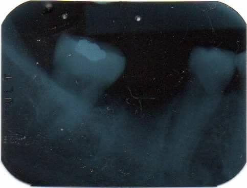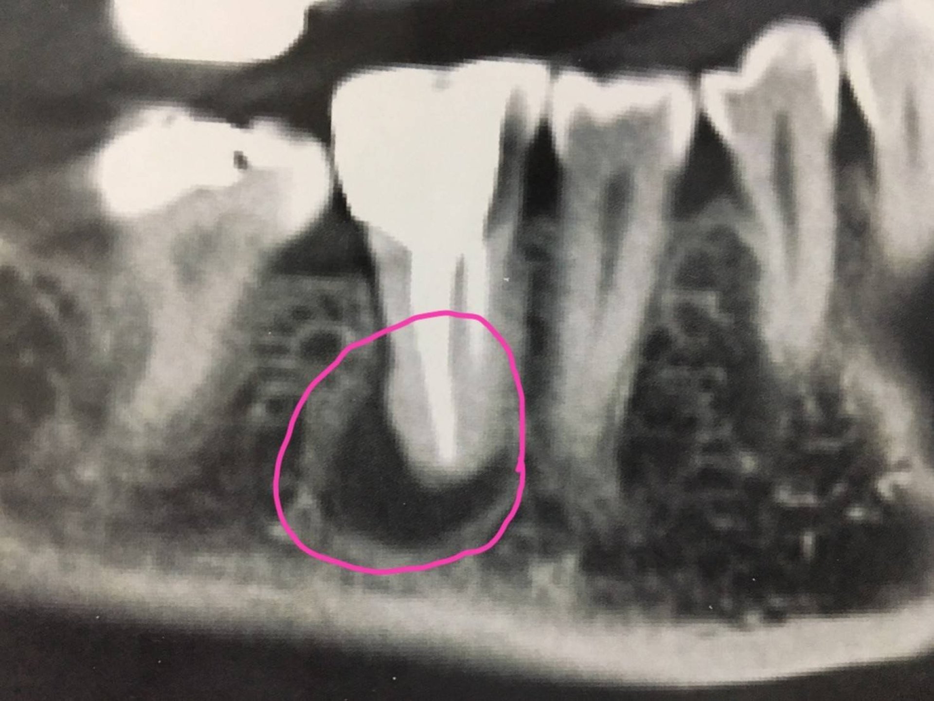 บริเวณสีดำในวงสีชมพู คือ กระดูกรองรับรากฟัน ที่เป็นโพรง เนื่องจากการรักษารากฟันไม่เป็นผลสำเร็จ จึงต้องถอนฟันซี่ดังกล่าวเมื่อปลาย มิย. 2560 เพื่อรอให้กระดูกรองรับรากฟัน มีการสร้างขึ้นมาใหม่ (ถมโพรงให้ตื้นขึ้นมา) เพื่อให้มีเนื้อที่กระดูกเพียงพอสำหรับการใส่รากฟันเทียม