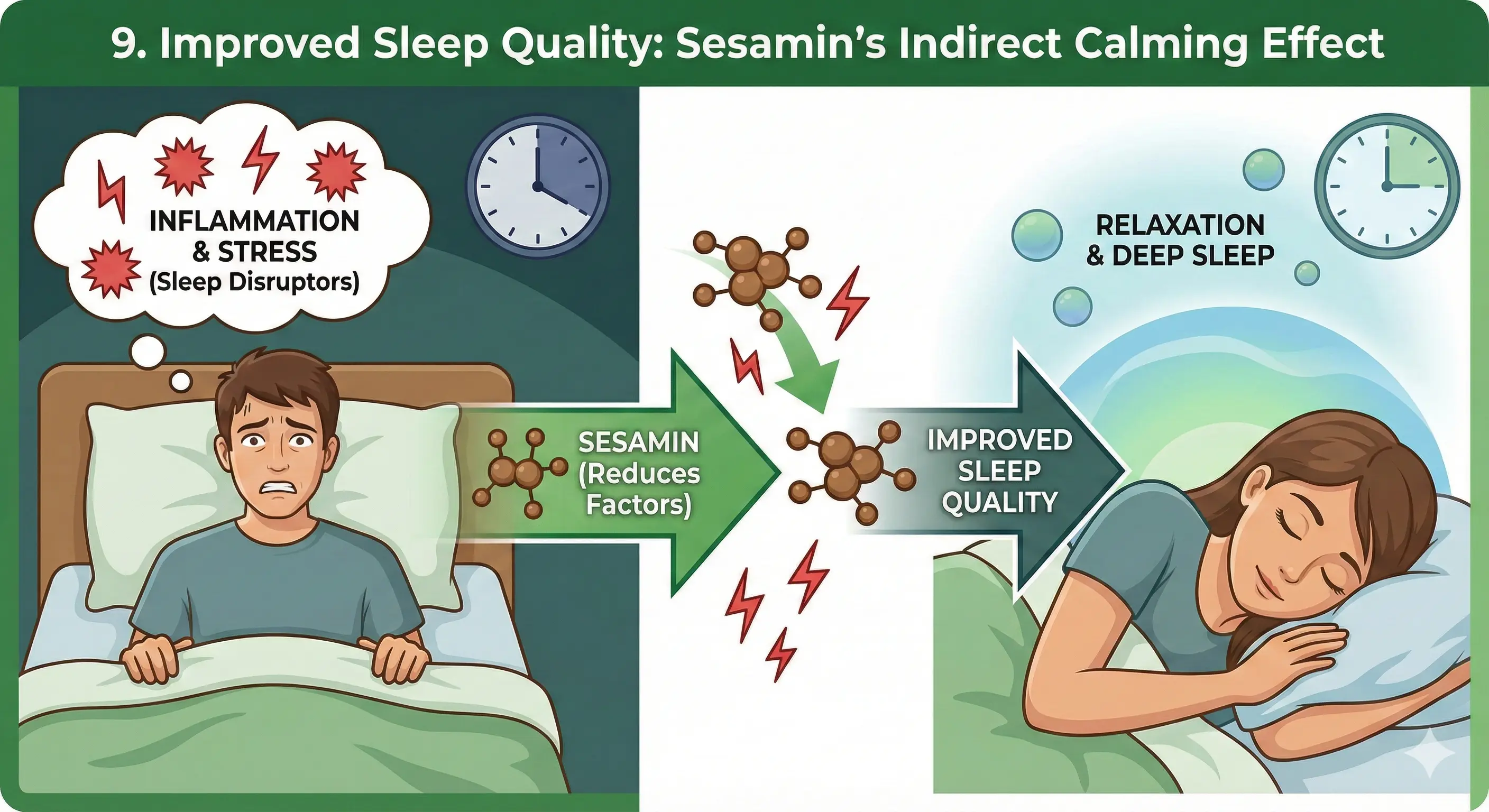 9. ส่งเสริมคุณภาพการนอนหลับ (Improved Sleep Quality) การอักเสบและความเครียดในร่างกายเป็นปัจจัยหนึ่งที่รบกวนการนอน การที่เซซามินช่วยลดปัจจัยเหล่านี้ อาจส่งผลทางอ้อมให้ร่างกายผ่อนคลายและนอนหลับได้มีคุณภาพมากขึ้น