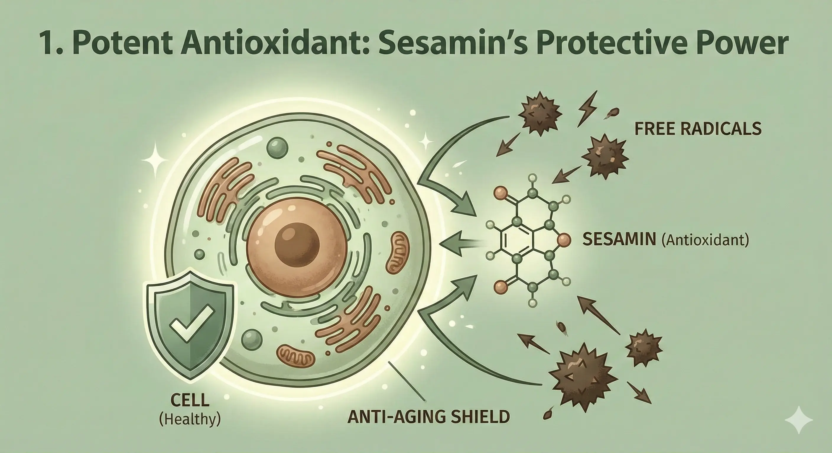 1. สุดยอดสารต้านอนุมูลอิสระ (Potent Antioxidant) นี่คือคุณสมบัติที่เป็นหัวใจสำคัญที่สุด เซซามินช่วยต่อต้าน "อนุมูลอิสระ" ตัวการร้ายที่ทำลายเซลล์และเร่งให้ร่างกายเสื่อมชรา การมีสารต้านอนุมูลอิสระที่เพียงพอจึงเปรียบเสมือนการมีเกราะป้องกันความเสื่อมให้แก่เซลล์ทั่วร่างกาย