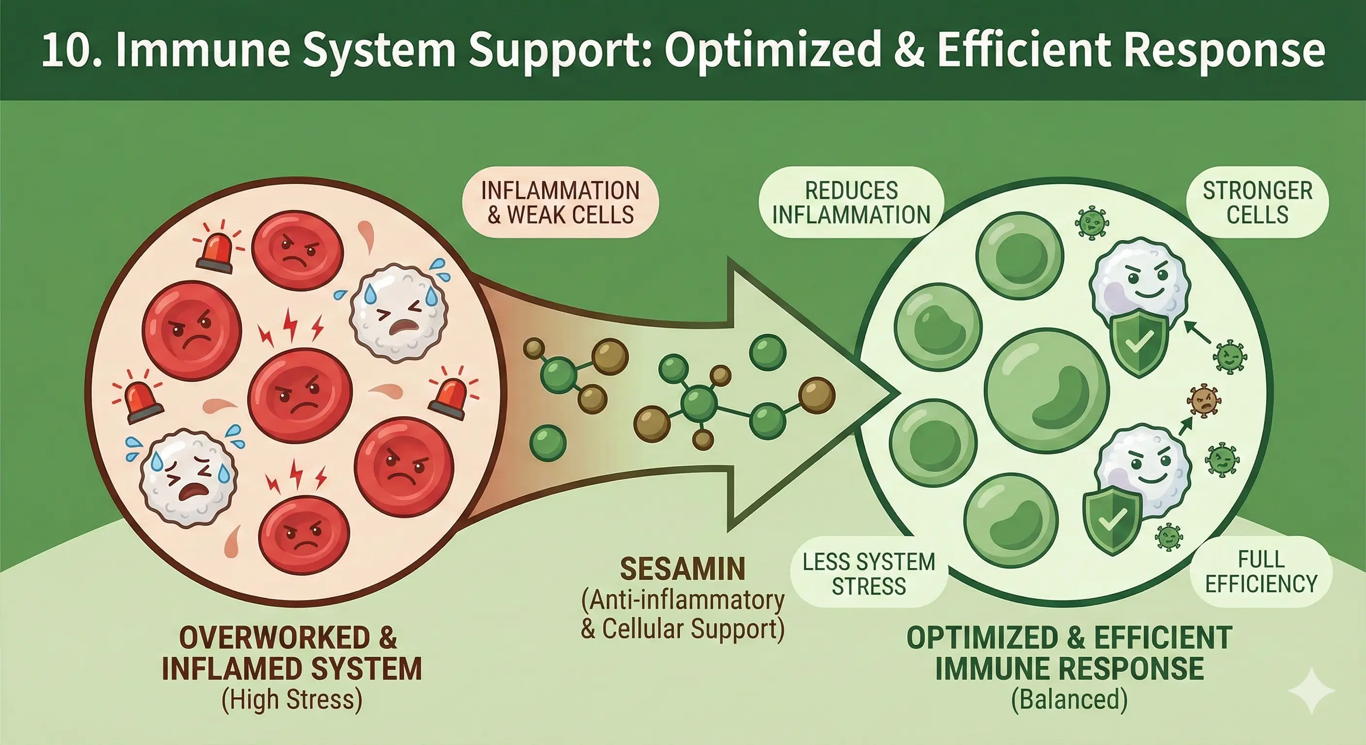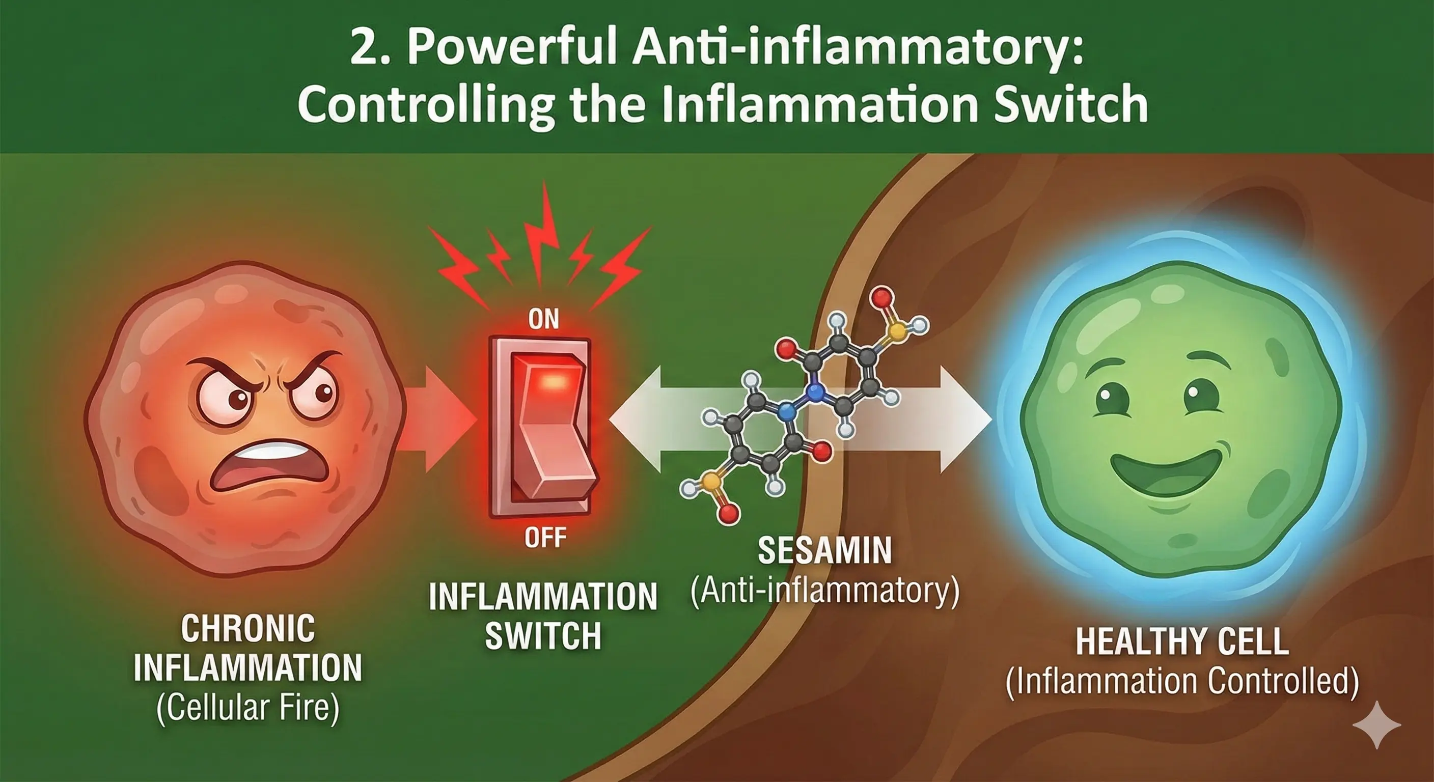 2. ลดการอักเสบเรื้อรังจากต้นตอ (Powerful Anti-inflammatory) การอักเสบที่ซ่อนเร้นอยู่ภายในร่างกาย (Chronic Inflammation) เป็นบ่อเกิดของโรคร้ายแรงหลายชนิด เซซามินมีคุณสมบัติในการเข้าไปควบคุม "สวิตช์" การอักเสบในระดับเซลล์ จึงเป็นการช่วยลดการอักเสบในระดับเซลล์ เป็นการแก้ไขที่ต้นเหตุของปัญหาจริงๆ