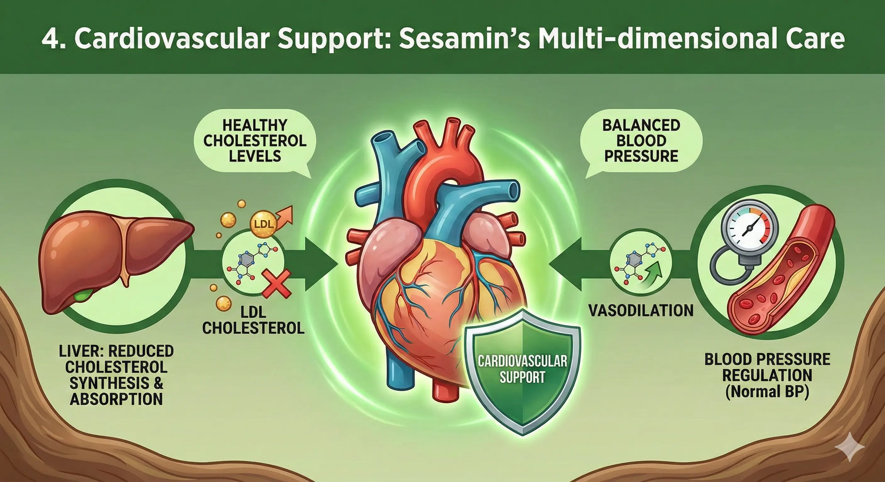 4. ดูแลสุขภาพหัวใจและหลอดเลือด (Cardiovascular Support) เซซามินมีส่วนช่วยดูแลสุขภาพหัวใจและหลอดเลือดในหลายมิติ ทั้งการช่วยลดการดูดซึมและสังเคราะห์คอเลสเตอรอลในตับ และอาจมีส่วนช่วยในการควบคุมความดันโลหิตให้อยู่ในเกณฑ์ปกติ