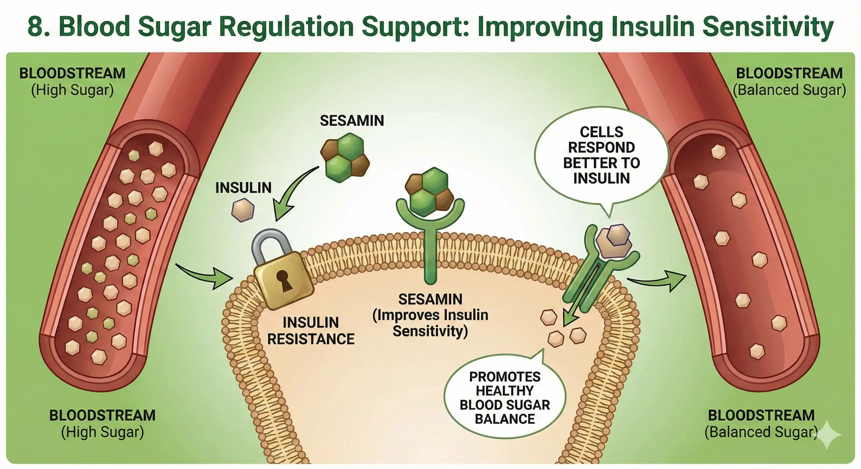 8. ช่วยควบคุมระดับน้ำตาลในเลือด (Blood Sugar Regulation Support) มีงานวิจัยบางส่วนที่ชี้ว่าเซซามินอาจมีส่วนช่วยให้เซลล์ตอบสนองต่ออินซูลินได้ดีขึ้น ซึ่งเป็นผลดีต่อการรักษาสมดุลของระดับน้ำตาลในเลือด