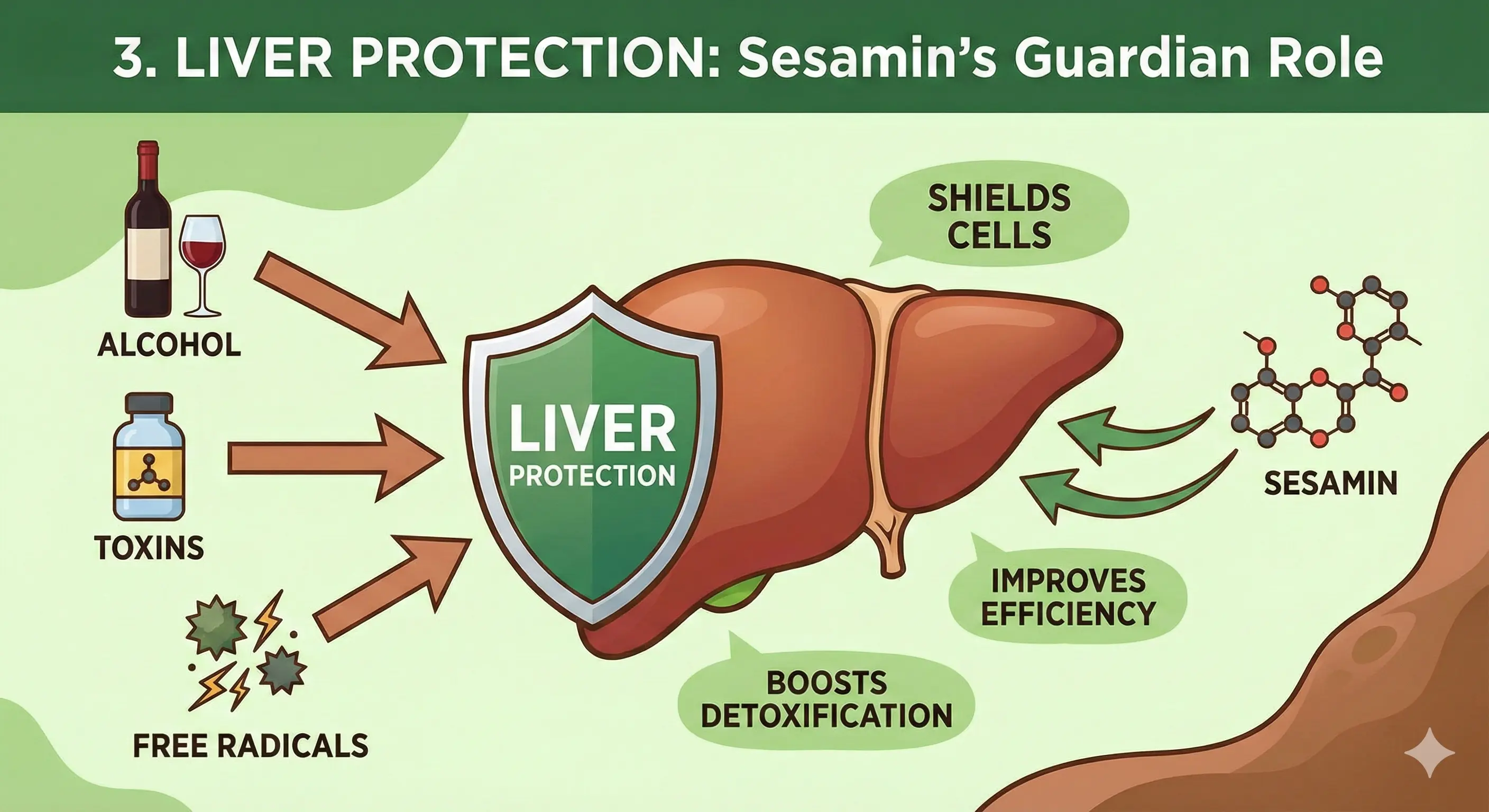 3. ปกป้องและบำรุงเซลล์ตับ (Liver Protection) ตับคืออวัยวะที่ทำงานหนักในการกำจัดสารพิษ เซซามินมีงานวิจัยรองรับว่ามีฤทธิ์ช่วยปกป้องเซลล์ตับจากการถูกทำลายโดยสารพิษ แอลกอฮอล์ และอนุมูลอิสระ ทั้งยังช่วยเสริมการทำงานของตับให้มีประสิทธิภาพยิ่งขึ้น