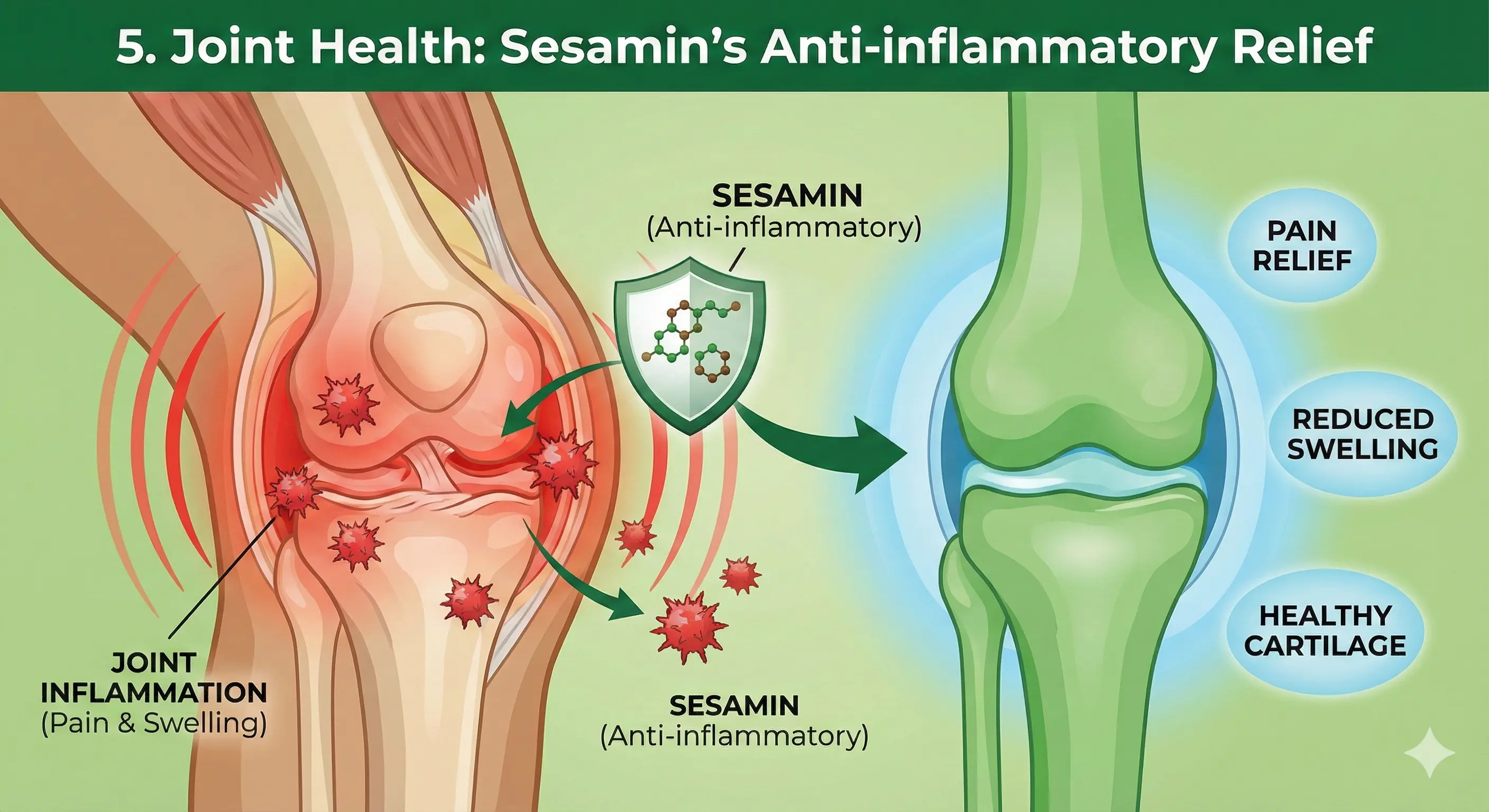 5. บรรเทาอาการปวดและอักเสบของข้อต่อ (Joint Health) ด้วยคุณสมบัติต้านการอักเสบที่โดดเด่น เซซามินจึงเป็นที่นิยมในกลุ่มผู้ที่มีปัญหาข้อเสื่อมและข้ออักเสบ เพราะอาจช่วยลดกระบวนการอักเสบในข้อต่อ ซึ่งเป็นสาเหตุหลักของอาการเจ็บปวดได้