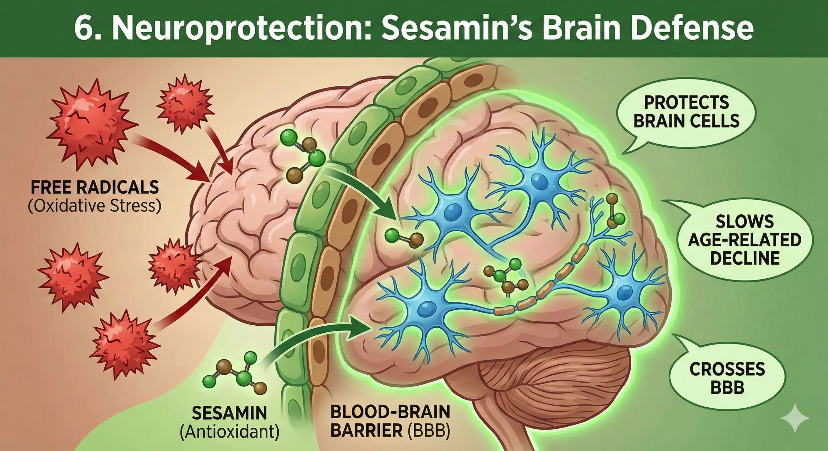 6. ดูแลสุขภาพสมองและระบบประสาท (Neuroprotection) สมองเป็นอวัยวะที่ถูกทำลายจากอนุมูลอิสระได้ง่าย การที่เซซามิน สามารถข้ามผ่านแนวกั้นระหว่างเลือดและสมองเข้าไปทำหน้าที่เป็นสารต้านอนุมูลอิสระได้ จึงอาจมีส่วนช่วยปกป้องเซลล์สมองและชะลอความเสื่อมที่เกี่ยวข้องกับอายุได้