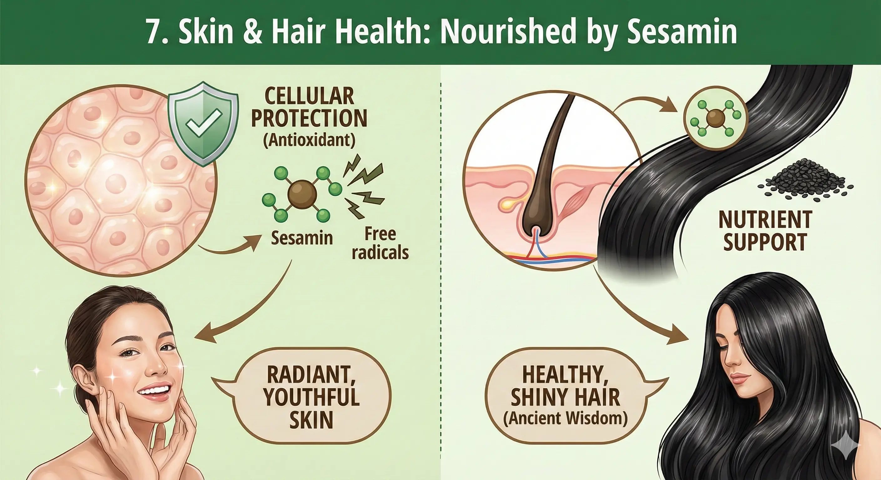 7. บำรุงผิวพรรณและเส้นผม (Skin & Hair Health) เมื่อเซลล์ได้รับการปกป้องจากอนุมูลอิสระ ผิวพรรณก็จะดูสดใสและอ่อนเยาว์ขึ้น นอกจากนี้ เซซามินและสารอาหารในงาดำยังถูกใช้ในการบำรุงเส้นผมให้ดกดำเงางามตามตำราโบราณมาอย่างยาวนาน