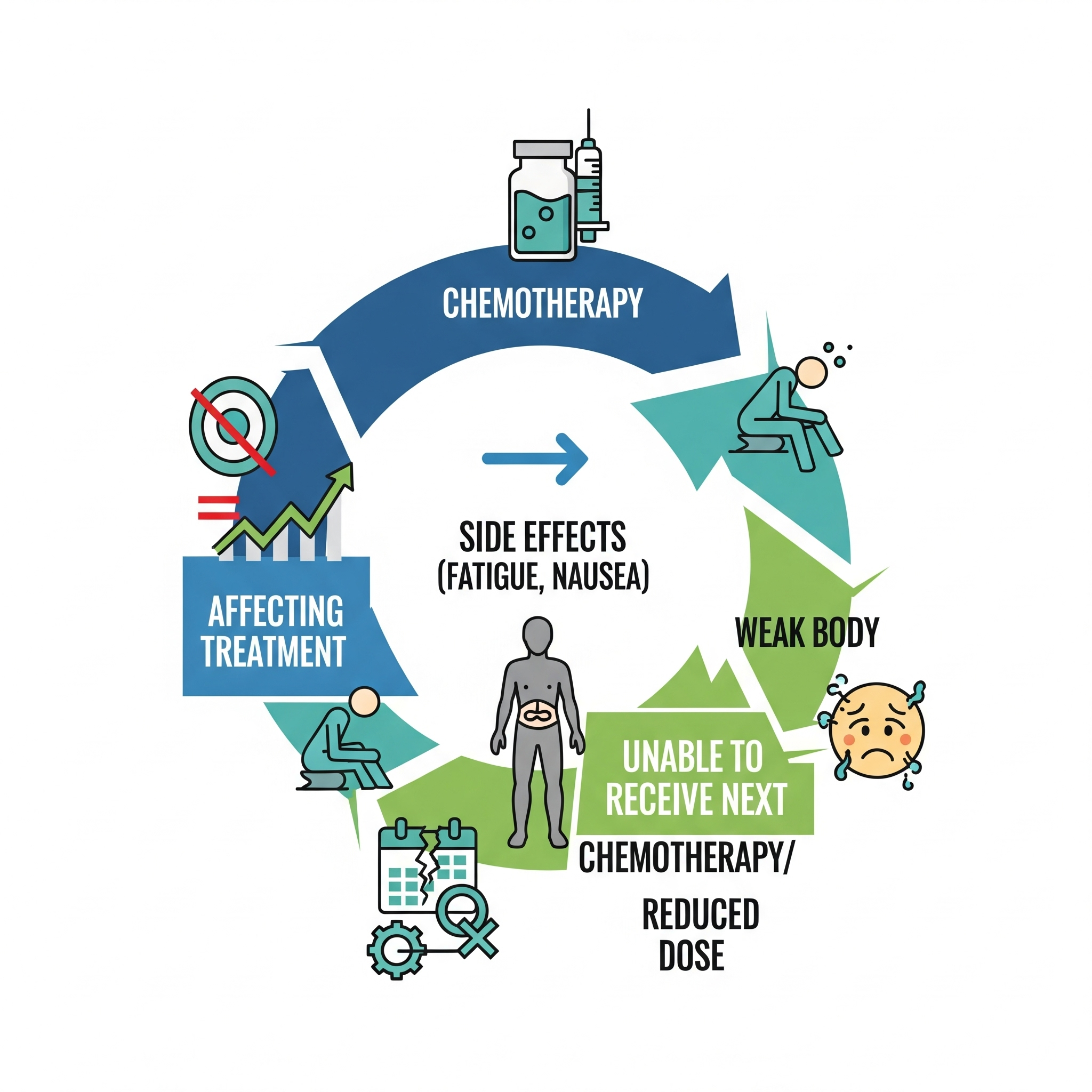 วงจรของปัญหา: คีโม -> ผลข้างเคียง (อ่อนเพลีย, คลื่นไส้) -> ร่างกายอ่อนแอ -> รับคีโมครั้งต่อไปไม่ได้/ต้องลดโดสยา -> กระทบผลการรักษา