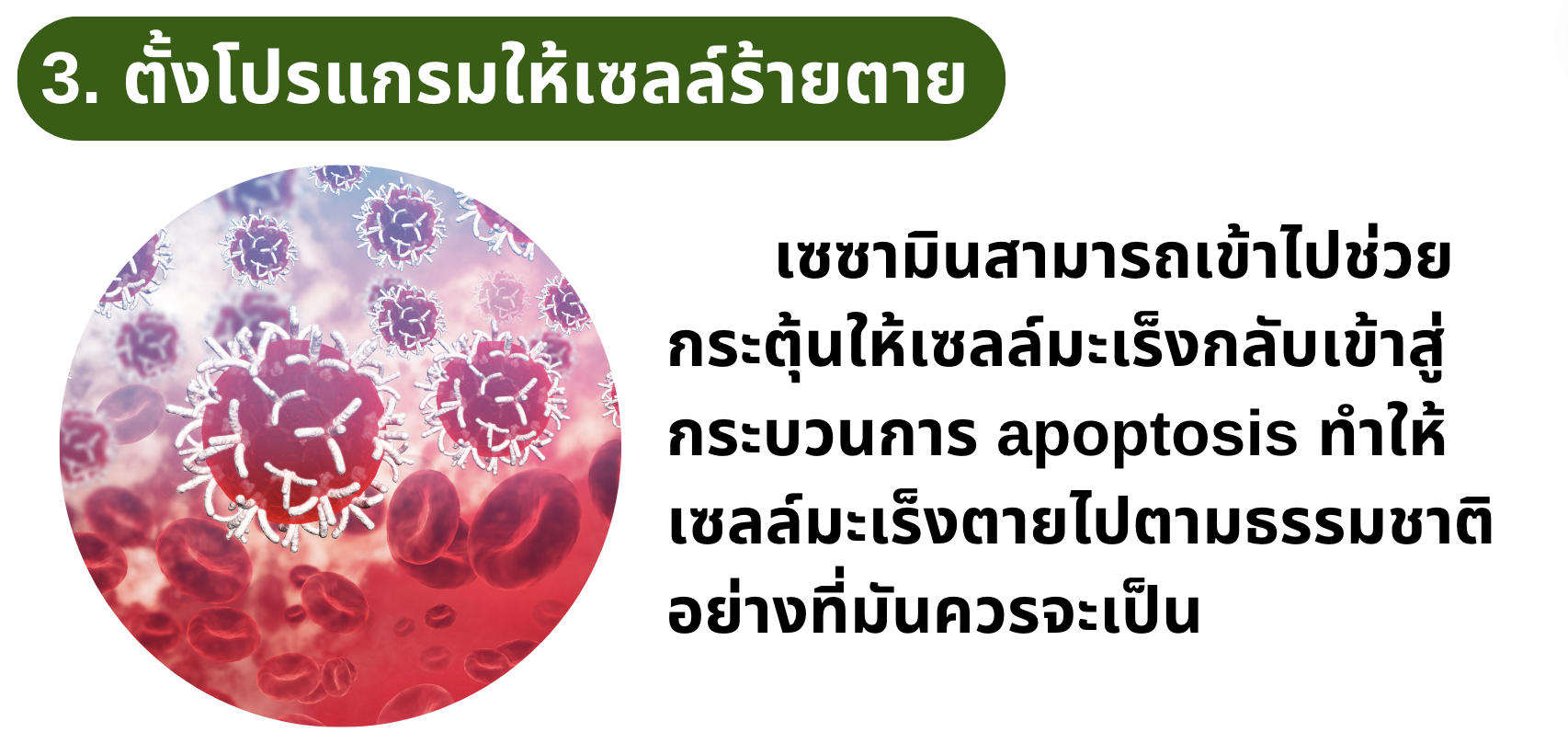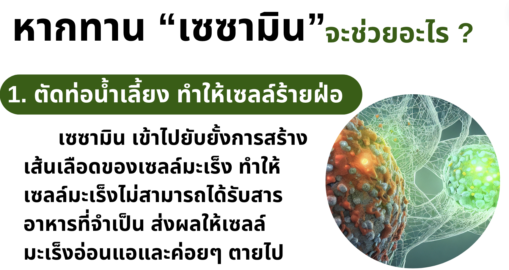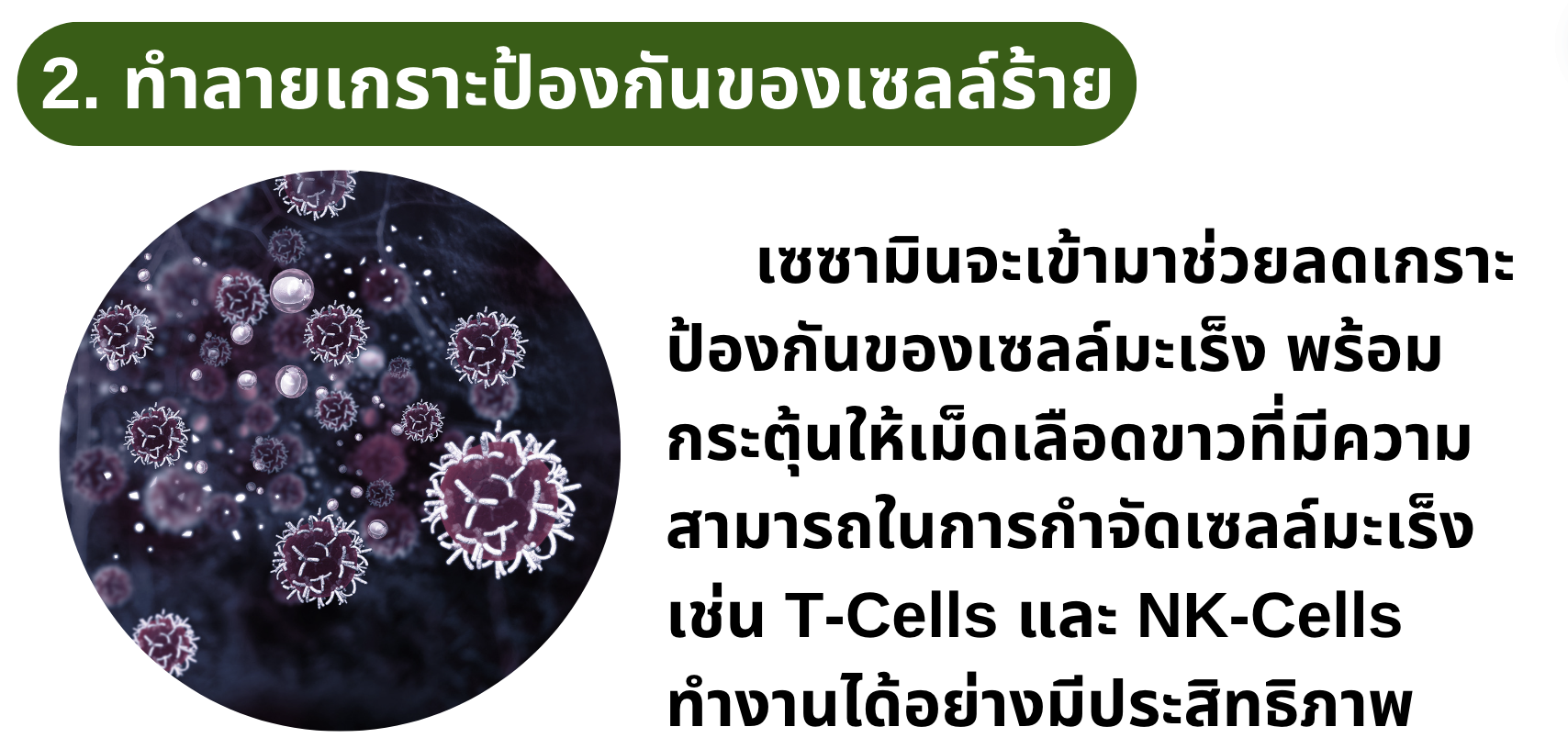 จากคุณสมบัติข้างต้น เซซามินจึงเข้ามามีบทบาทเป็นอาหารเสริมสำหรับผู้ป่วยมะเร็งที่ช่วยเติมเต็มในส่วนที่ขาดหายไป โดยการทำงานแบบองค์รวมเพื่อ: